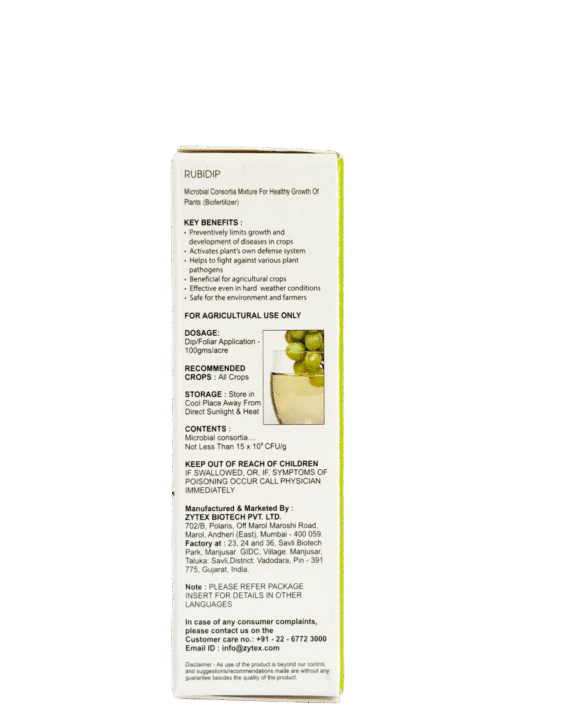 Rubidip is a premium concentrated microbial consortia formulation designed to promote vigorous plant growth and protect crops from a wide range of foliar and soil-borne fungal diseases. Its powerful blend of beneficial microbes activates the plant’s natural defense system, helping crops stay healthy even under challenging weather and disease-prone conditions. Rubidip ensures healthier crops and higher productivity. Safe for farmers, soil, and the environment, it is an ideal fit for sustainable and integrated crop management programs.